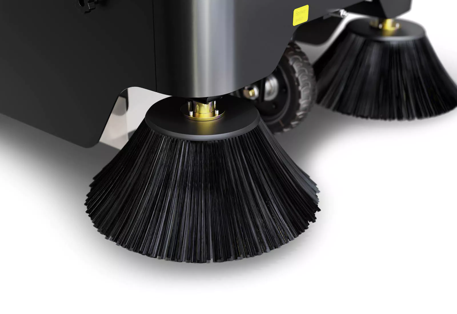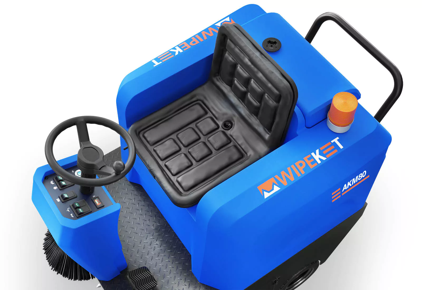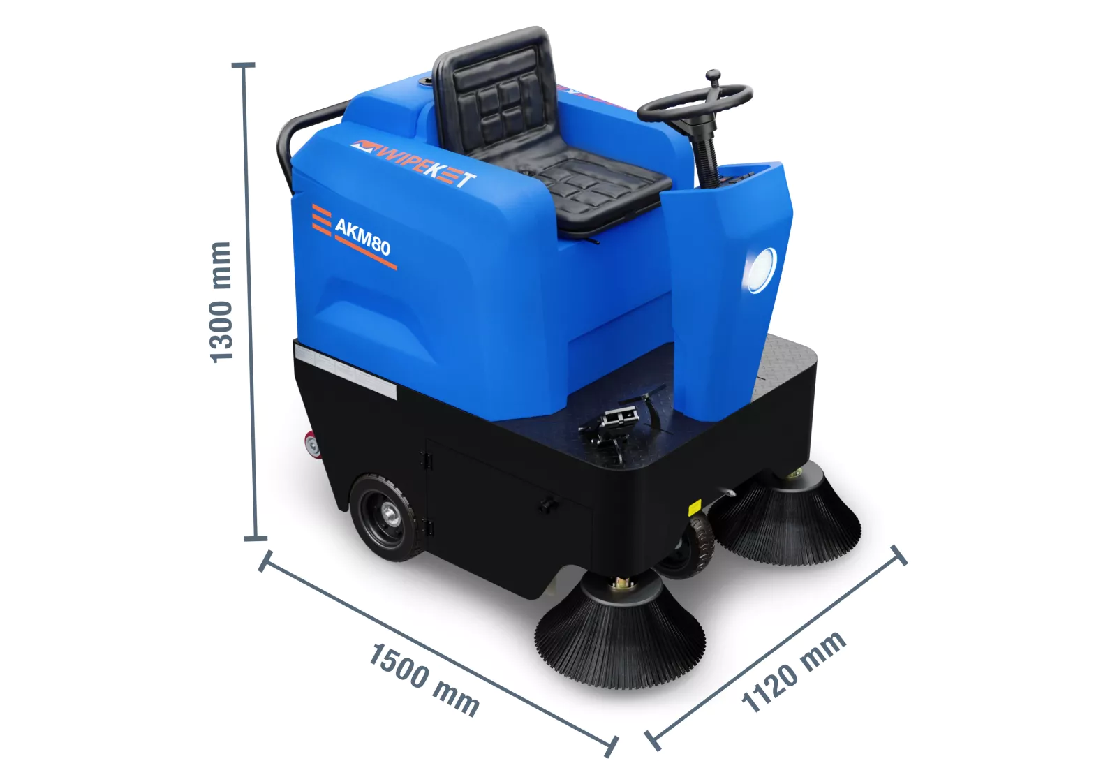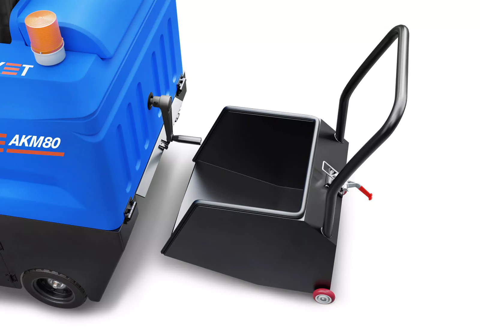 Con la AKM80, la limpieza sin residuos de superficies interiores y exteriores no supone ningún problema. La gran barredora con conductor a bordo puede equiparse con 10 litros de agua fresca que pulveriza el suelo. Esta tecnología evita que el polvo se arremoline, y toda la suciedad se transporta en poco tiempo al gran depósito de polvo de 80 litros. De ello se encargan los tres cepillos que, gracias a su inteligente disposición, alcanzan una anchura total de limpieza de 1.250 mm. Los cepillos laterales, con un diámetro de 400 mm, transportan toda la suciedad por debajo de la máquina, mientras que el largo cepillo principal se encarga de transportar los residuos al depósito de polvo. Esto sólo es posible gracias a la alta velocidad de rotación de hasta 1.800 rpm. La compacta máquina de limpieza (1.120 mm x 1.500 mm x 1.300 mm) y su bajo peso de 396 kg, combinados con una alta potencia de accionamiento de 800 W, permiten una velocidad máxima de 8 km/h. Esto proporciona a la barredora con conductor a bordo AKM80 una capacidad de limpieza efectiva de 8.400 m²/h. Esto permite una limpieza muy eficaz de grandes superficies. La brillante iluminación frontal le permite barrer con la máquina incluso en la oscuridad.
