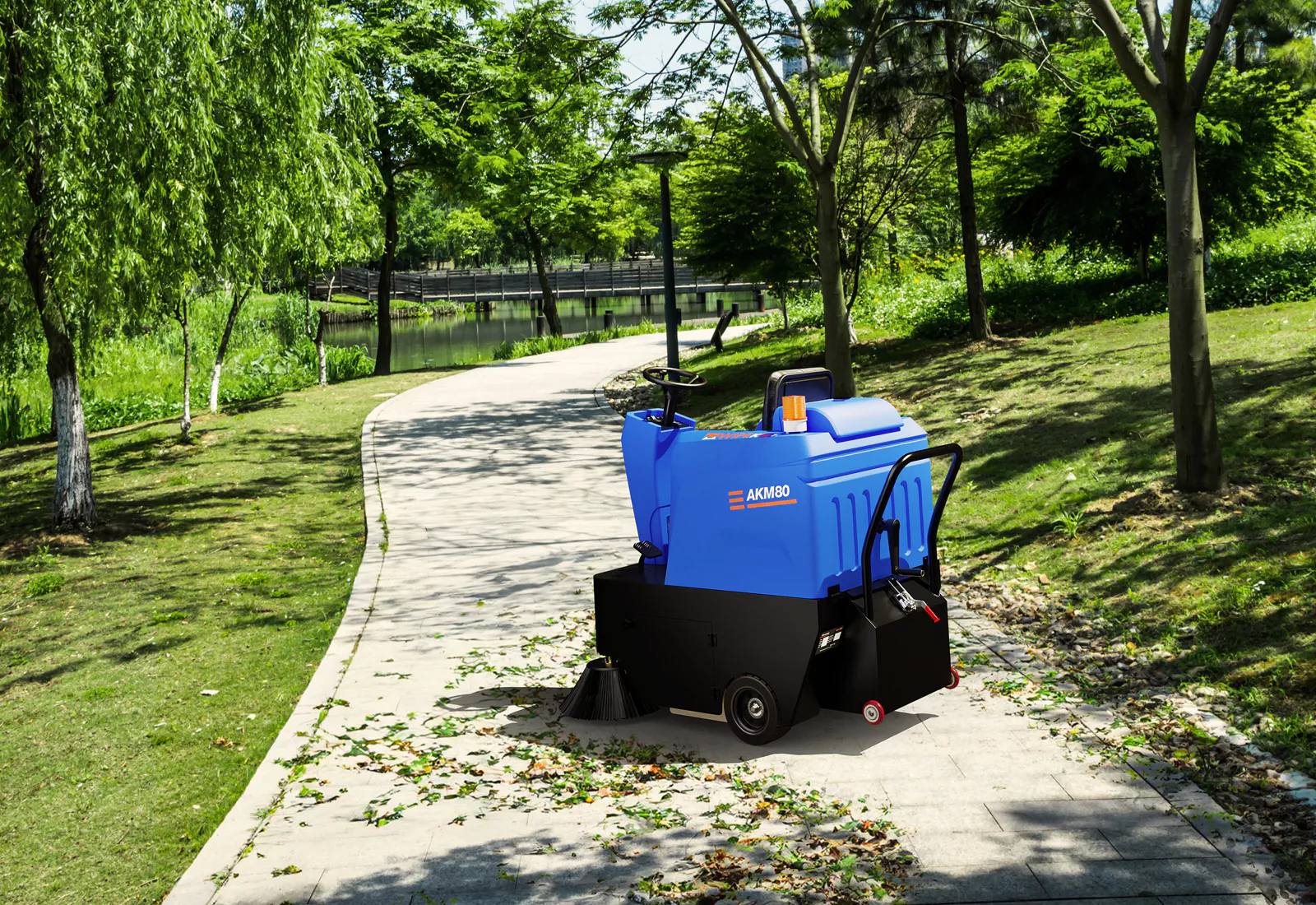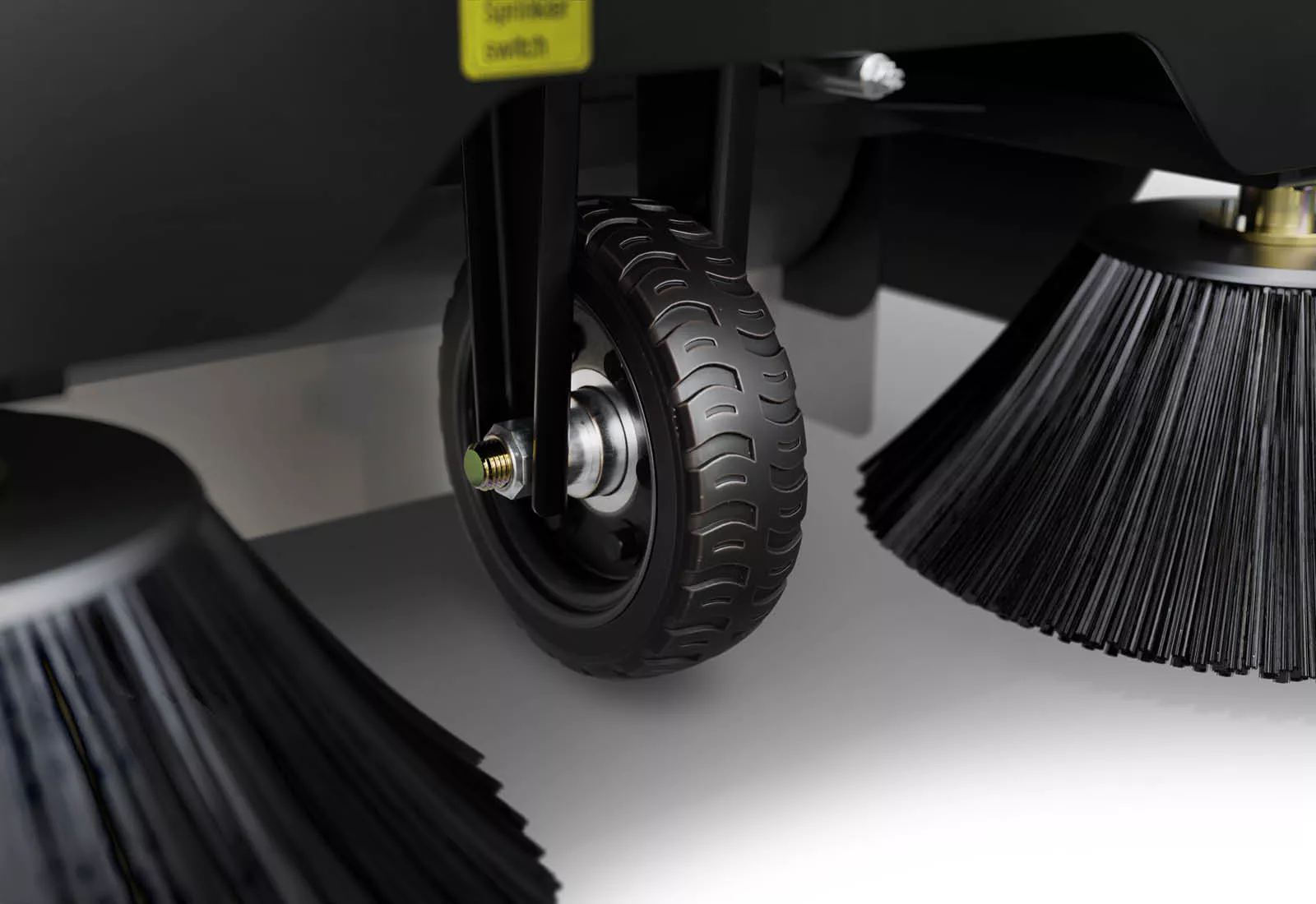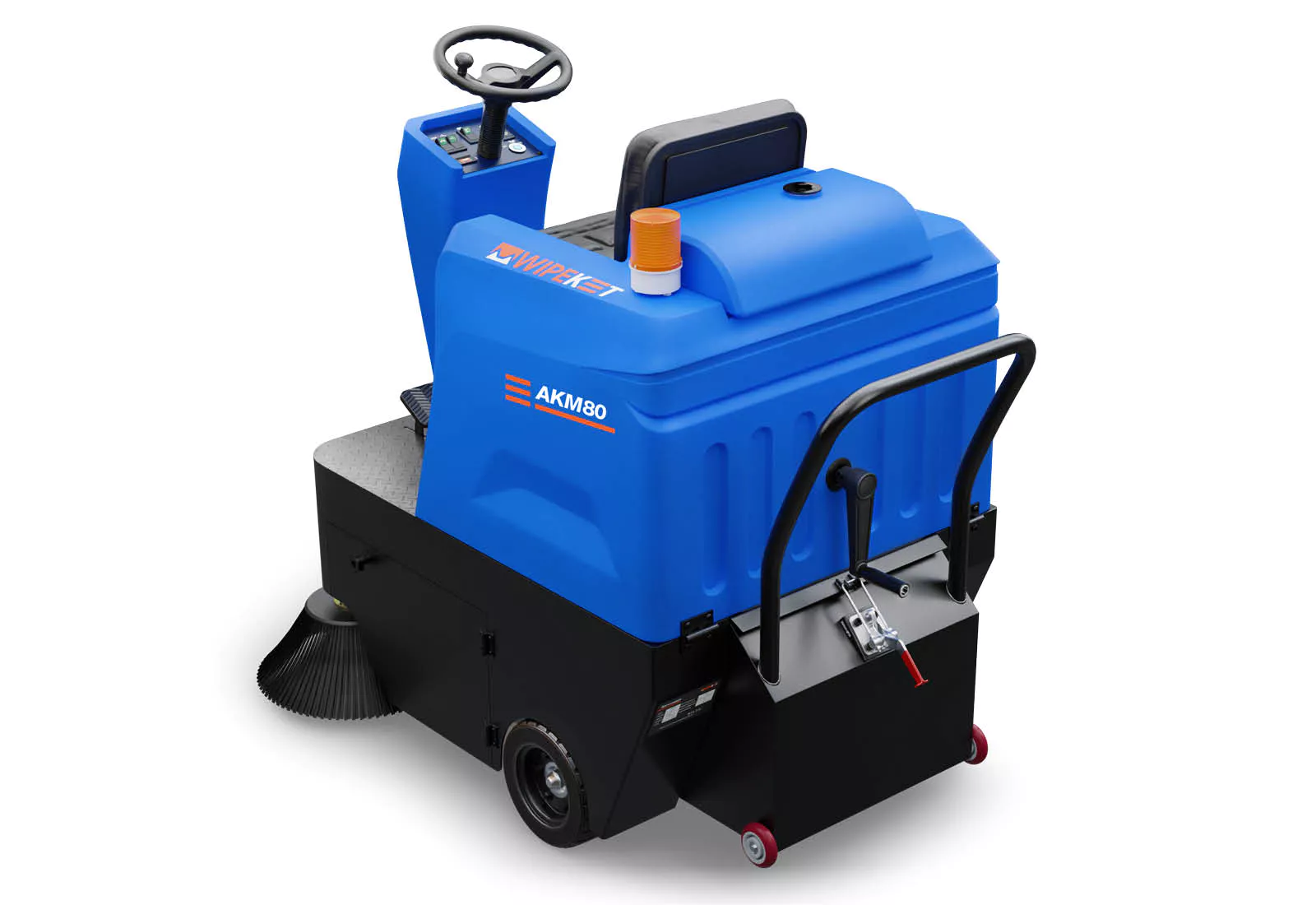Con la AKM80, la limpieza sin residuos de superficies interiores y exteriores no supone ningún problema. La gran barredora con conductor a bordo puede equiparse con 10 litros de agua fresca que pulveriza el suelo. Esta tecnología evita que el polvo se arremoline, y toda la suciedad se transporta en poco tiempo al gran depósito de polvo de 80 litros. De ello se encargan los tres cepillos que, gracias a su inteligente disposición, alcanzan una anchura total de limpieza de 1.250 mm. Los cepillos laterales, con un diámetro de 400 mm, transportan toda la suciedad por debajo de la máquina, mientras que el largo cepillo principal se encarga de transportar los residuos al depósito de polvo. Esto sólo es posible gracias a la alta velocidad de rotación de hasta 1.800 rpm. La compacta máquina de limpieza (1.120 mm x 1.500 mm x 1.300 mm) y su bajo peso de 396 kg, combinados con una alta potencia de accionamiento de 800 W, permiten una velocidad máxima de 8 km/h. Esto proporciona a la barredora con conductor a bordo AKM80 una capacidad de limpieza efectiva de 8.400 m²/h. Esto permite una limpieza muy eficaz de grandes superficies. La brillante iluminación frontal le permite barrer con la máquina incluso en la oscuridad.